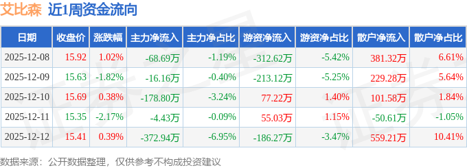 资金流向数据方面,本周艾比森主力资金合计净流出641.03万元,游资资金合计净流出579.76万元,散户资金合计净流入1220.78万元。本周资金流向一览见下表: