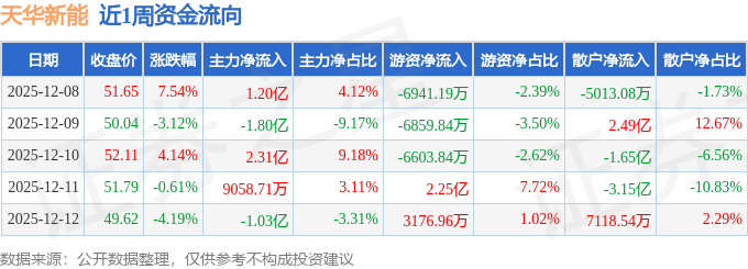资金流向数据方面,本周天华新能主力资金合计净流入1.58亿元,游资资金合计净流入5255.12万元,散户资金合计净流出2.11亿元。本周资金流向一览见下表: