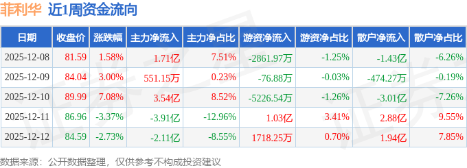 资金流向数据方面,本周菲利华主力资金合计净流出7089.78万元,游资资金合计净流入3816.74万元,散户资金合计净流入3273.05万元。本周资金流向一览见下表: