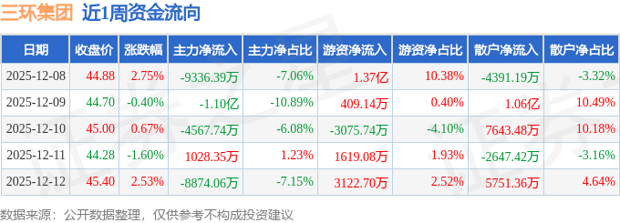 资金流向数据方面,本周三环集团主力资金合计净流出3.28亿元,游资资金合计净流入1.58亿元,散户资金合计净流入1.7亿元。本周资金流向一览见下表: