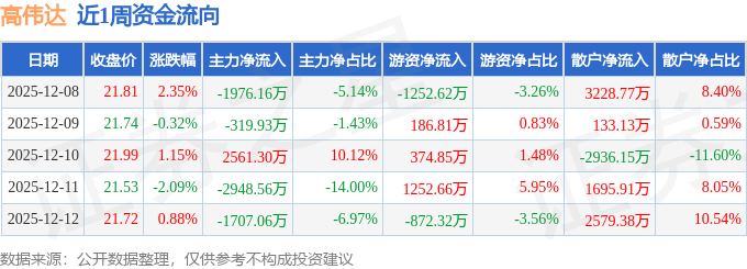 资金流向数据方面,本周高伟达主力资金合计净流出4390.41万元,游资资金合计净流出310.62万元,散户资金合计净流入4701.04万元。本周资金流向一览见下表: