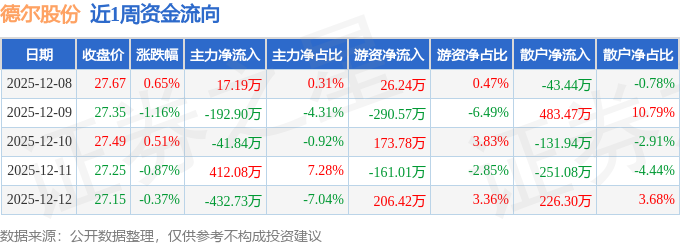 资金流向数据方面,本周德尔股份主力资金合计净流出238.19万元,游资资金合计净流出45.13万元,散户资金合计净流入283.32万元。本周资金流向一览见下表: