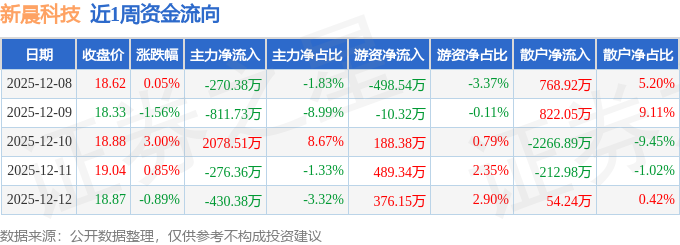 资金流向数据方面,本周新晨科技主力资金合计净流入289.66万元,游资资金合计净流入545.0万元,散户资金合计净流出834.66万元。本周资金流向一览见下表: