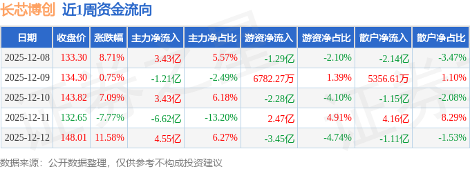 资金流向数据方面,本周长芯博创主力资金合计净流入3.57亿元,游资资金合计净流出3.87亿元,散户资金合计净流入2969.35万元。本周资金流向一览见下表: