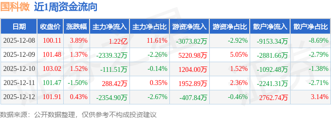 资金流向数据方面,本周国科微主力资金合计净流入7709.86万元,游资资金合计净流入4896.2万元,散户资金合计净流出1.26亿元。本周资金流向一览见下表:
