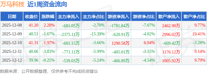 资金流向数据方面,本周万马科技主力资金合计净流出5047.46万元,游资资金合计净流出1984.08万元,散户资金合计净流入7031.54万元。本周资金流向一览见下表: