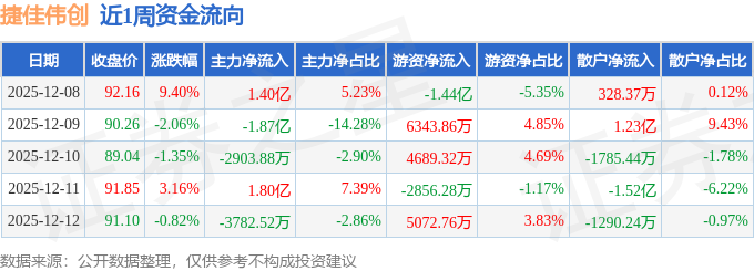 资金流向数据方面,本周捷佳伟创主力资金合计净流入6666.01万元,游资资金合计净流出1103.47万元,散户资金合计净流出5562.54万元。本周资金流向一览见下表:
