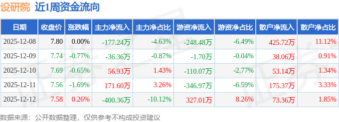 资金流向数据方面,本周设研院主力资金合计净流出385.44万元,游资资金合计净流出380.21万元,散户资金合计净流入765.65万元。本周资金流向一览见下表:
