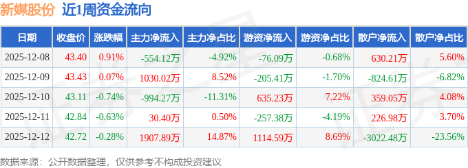 资金流向数据方面,本周新媒股份主力资金合计净流入1419.91万元,游资资金合计净流入1210.94万元,散户资金合计净流出2630.85万元。本周资金流向一览见下表: