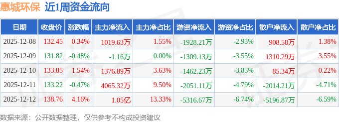 沪深股通持股方面,截止2025年12月12日收盘,惠城环保深股通持股数为150.07万股,占流通股比为101.0%。