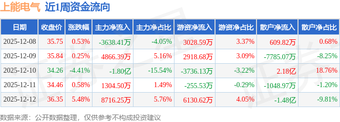 资金流向数据方面,本周上能电气主力资金合计净流出6795.76万元,游资资金合计净流入8086.24万元,散户资金合计净流出1290.48万元。本周资金流向一览见下表: