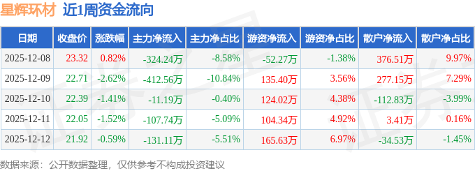 资金流向数据方面,本周星辉环材主力资金合计净流出986.84万元,游资资金合计净流入477.13万元,散户资金合计净流入509.71万元。本周资金流向一览见下表:
