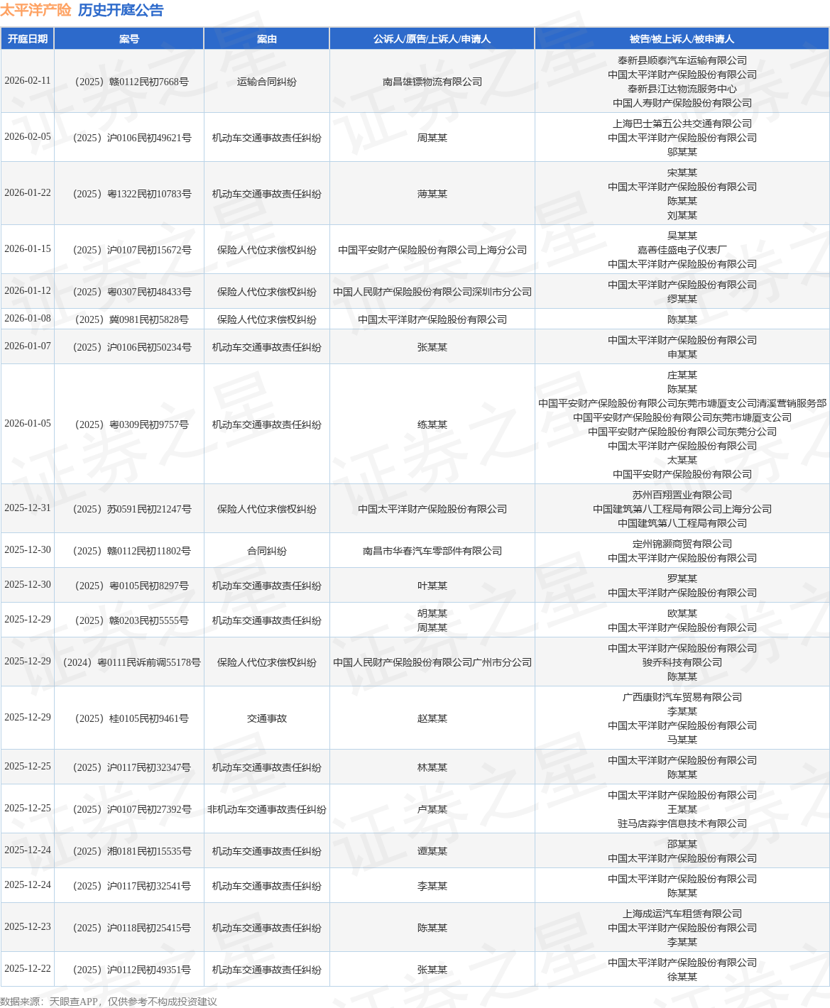 案号:(2025)沪0105民初13865号根据统计,近一年内以中国太平洋财产保险股份有限公司为当事人的历史开庭公告有696则,其中案由为“机动车交通事故责任纠纷”的公告以455则居首,其次为“保险人代位求偿权纠纷”有78则,“非机动车交通事故责任纠纷”有28则。历史开庭公告(前20条)如下: