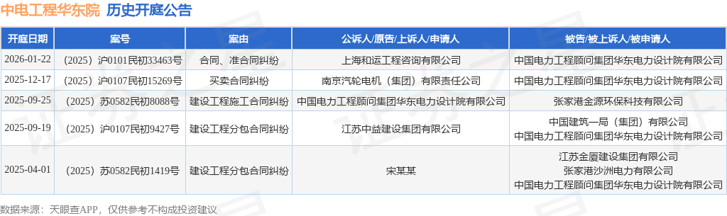 案号:(2025)沪0107民初15269号根据统计,近一年内以中国电力工程顾问集团华东电力设计院有限公司为当事人的历史开庭公告有5则,其中案由为“建设工程分包合同纠纷”的公告以2则居首,其次为“买卖合同纠纷”有1则,“合同、准合同纠纷”有1则。历史开庭公告如下: