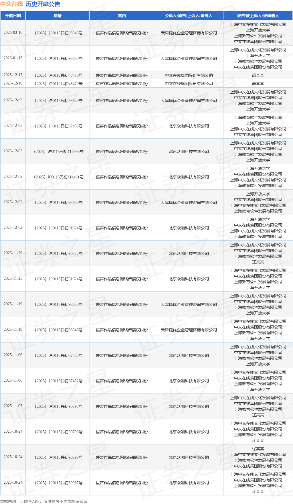 案号:(2025)沪0112民初48470号根据统计,近一年内以中文在线集团股份有限公司为当事人的历史开庭公告有53则,其中案由为“侵害作品信息网络传播权纠纷”的公告以40则居首,其次为“侵害商标权纠纷”有6则,“合同纠纷”有3则。历史开庭公告(前20条)如下: