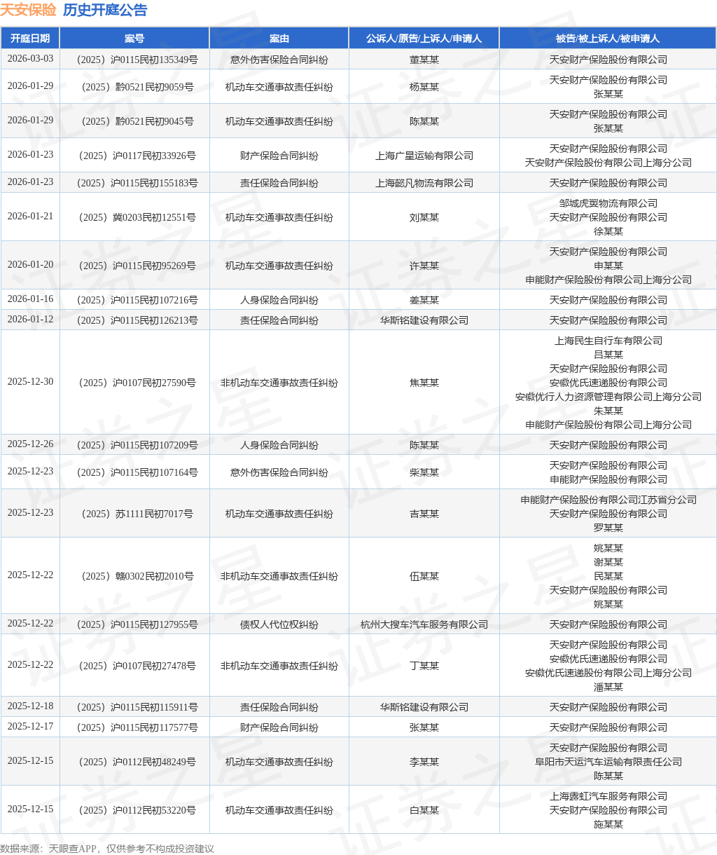案号:(2025)沪0115民初117577号根据统计,近一年内以天安财产保险股份有限公司为当事人的历史开庭公告有418则,其中案由为“机动车交通事故责任纠纷”的公告以219则居首,其次为“财产保险合同纠纷”有50则,“责任保险合同纠纷”有26则。历史开庭公告(前20条)如下: