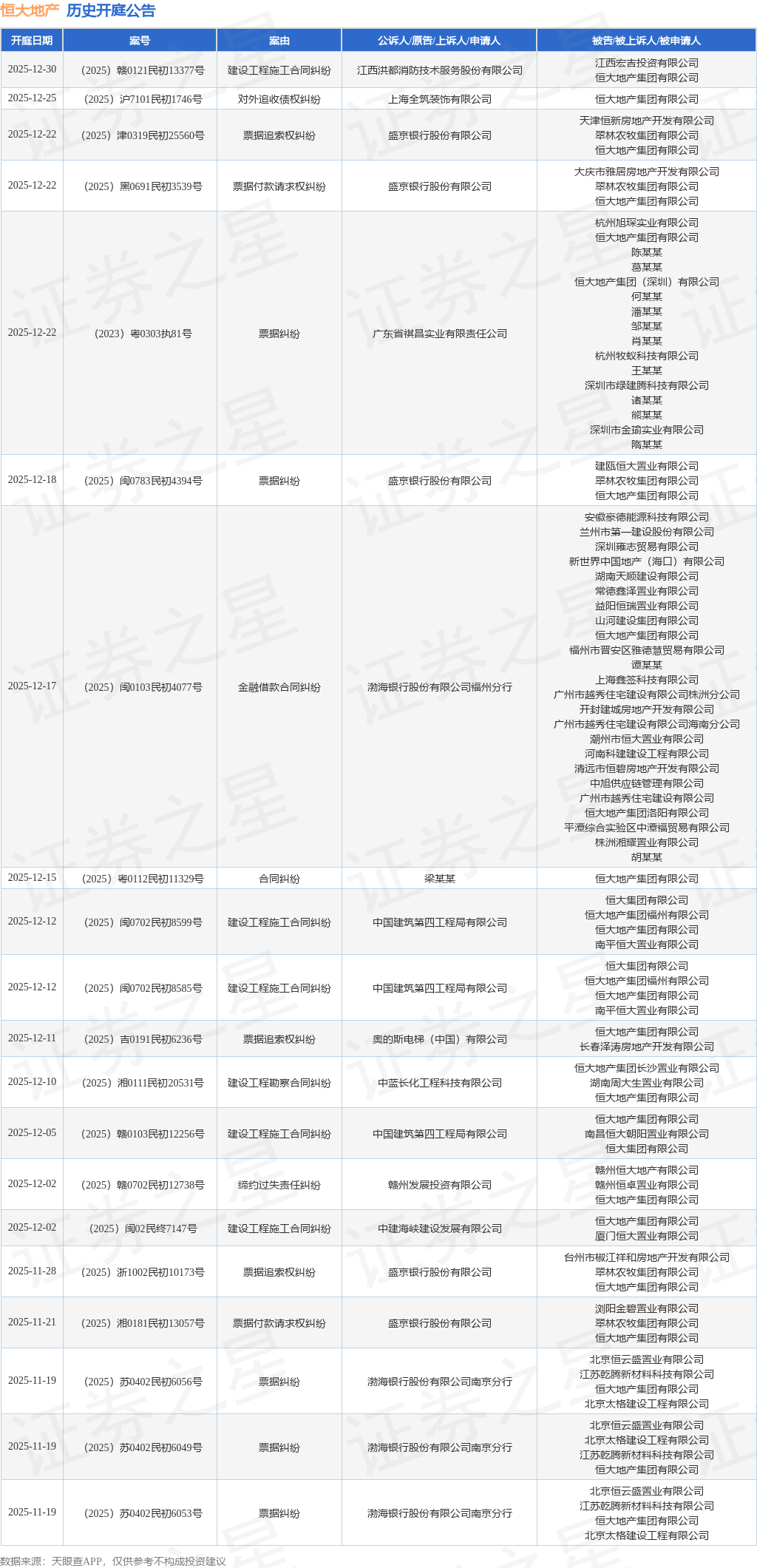根据统计,近一年内以恒大地产集团有限公司为当事人的历史开庭公告有658则,其中案由为“票据纠纷”的公告以187则居首,其次为“建设工程施工合同纠纷”有108则,“合同纠纷”有106则。历史开庭公告(前20条)如下: