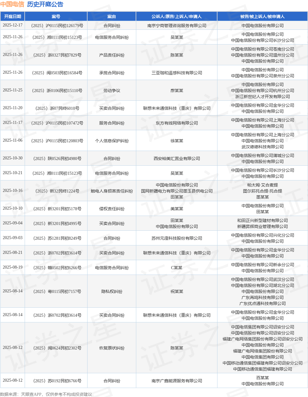 案号:(2025)沪0115民初126179号根据统计,近一年内以中国电信股份有限公司为当事人的历史开庭公告有56则,其中案由为“买卖合同纠纷”的公告以12则居首,其次为“合同纠纷”有10则,“电信服务合同纠纷”有8则。历史开庭公告(前20条)如下: