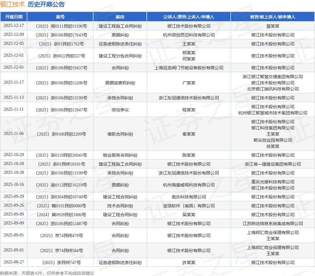 案号:(2025)闽0211民初11106号根据统计,近一年内以银江技术股份有限公司为当事人的历史开庭公告有87则,其中案由为“票据追索权纠纷”的公告以13则居首,其次为“合同纠纷”有12则,“票据纠纷”有7则。历史开庭公告(前20条)如下: