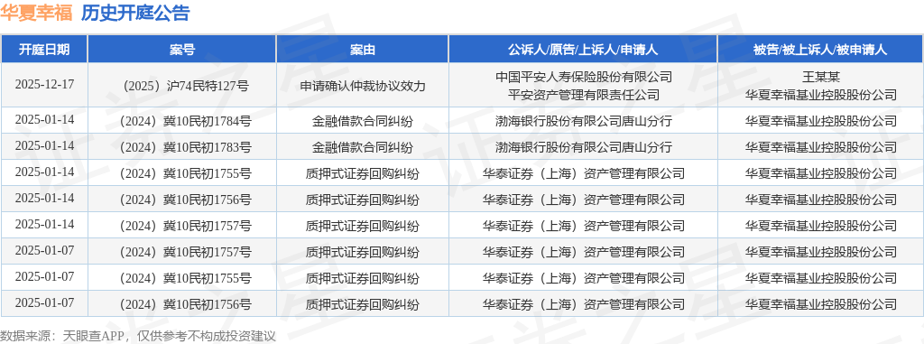 案号:(2025)沪74民特127号根据统计,近一年内以华夏幸福基业控股股份公司为当事人的历史开庭公告有9则,其中案由为“质押式证券回购纠纷”的公告以6则居首,其次为“金融借款合同纠纷”有2则,“申请确认仲裁协议效力”有1则。历史开庭公告如下: