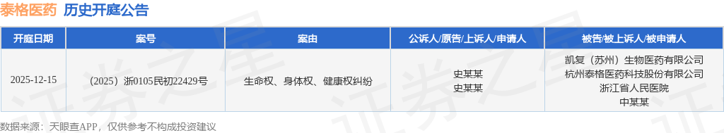 根据统计,近一年内以杭州泰格医药科技股份有限公司为当事人的历史开庭公告有1则,其中案由为“生命权、身体权、健康权纠纷”的公告以1则居首。历史开庭公告如下: