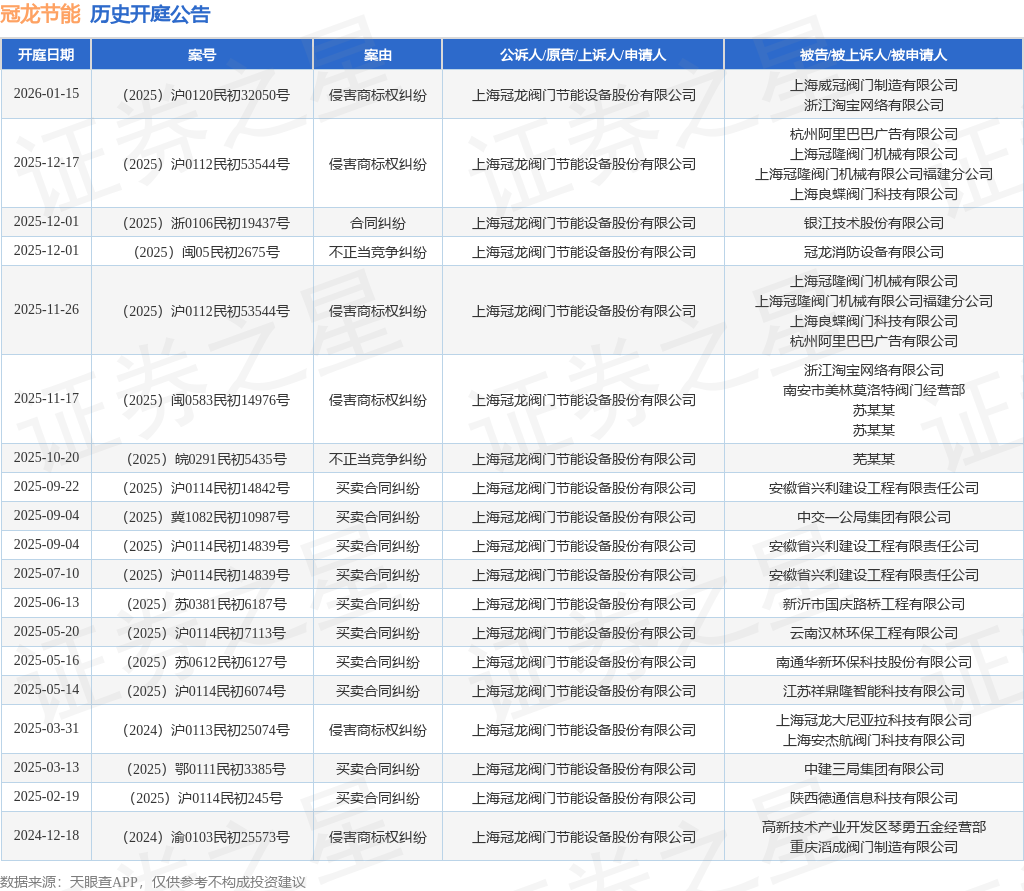 案号:(2025)沪0112民初53544号根据统计,近一年内以上海冠龙阀门节能设备股份有限公司为当事人的历史开庭公告有19则,其中案由为“买卖合同纠纷”的公告以10则居首,其次为“侵害商标权纠纷”有6则,“不正当竞争纠纷”有2则。历史开庭公告如下: