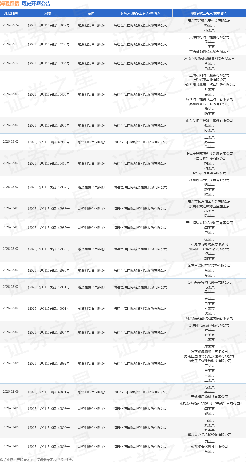 案号:(2025)沪民终505号根据统计,近一年内以海通恒信国际融资租赁股份有限公司为当事人的历史开庭公告有1077则,其中案由为“融资租赁合同纠纷”的公告以978则居首,其次为“申请实现担保物权”有28则,“合同纠纷”有17则。历史开庭公告(前20条)如下: