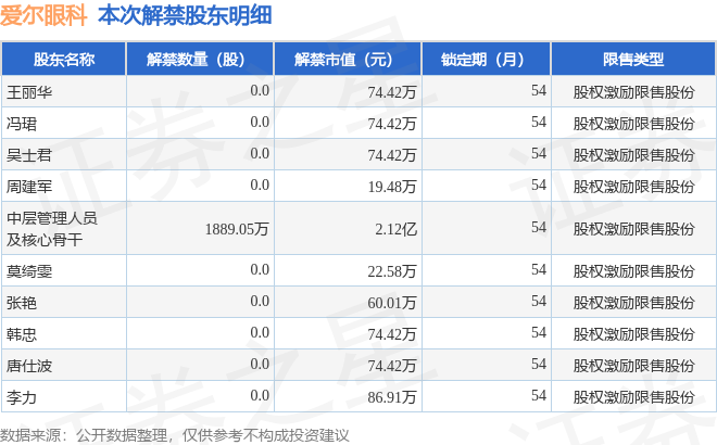 证券之星消息,根据市场公开信息整理,爱尔眼科(300015)于12月15日将有1889.05万股限售股份解禁,为公司股权激励限售股份,占公司总股本0.2%。(本次数据根据历史公告整理得出,实际情况以上市公司最新公告为准)最近一年内,该股累计解禁2624.16万股,占总股本的0.28%。本次解禁后,公司还有13.7亿股限售股份,占总股本14.69%。具体如下图所示: