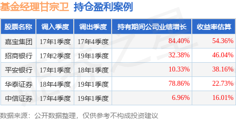 甘宗卫管理的工银金融地产混合A基金在17年1季度买入嘉宝集团,在持有3个季度后在17年4季度卖出。持有期间的估算收益率为54.36%,持有期间嘉宝集团在2016年到2017年的年报归属净利润增幅达84.4%。