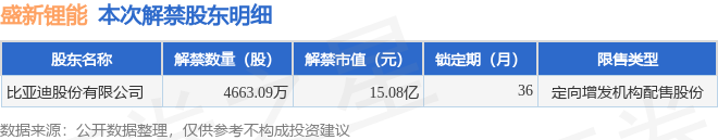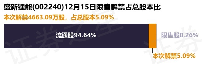 证券之星消息,根据市场公开信息整理,盛新锂能(002240)于12月15日将有4663.09万股限售股份解禁,为公司定向增发机构配售股份,占公司总股本5.09%。(本次数据根据历史公告整理得出,实际情况以上市公司最新公告为准)本次解禁后,公司还有238.51万股限售股份,占总股本0.26%。具体如下图所示: