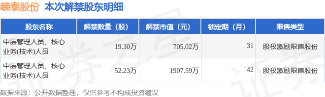 证券之星消息,根据市场公开信息整理,嵘泰股份(605133)于12月15日将有71.54万股限售股份解禁,为公司股权激励限售股份,占公司总股本0.25%。(本次数据根据历史公告整理得出,实际情况以上市公司最新公告为准)最近一年内,该股累计解禁4188.15万股,占总股本的14.81%。本次解禁后,公司还有68.85万股限售股份,占总股本0.24%。具体如下图所示: