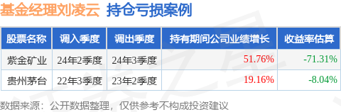 刘凌云管理的山证资管裕鑫180天持有期债券发起式A基金在24年2季度买入紫金矿业,在持有1个季度后在24年3季度卖出。持有期间的估算收益率为-71.31%,持有期间紫金矿业在2023年到2024年的年报归属净利润增幅达51.76%。