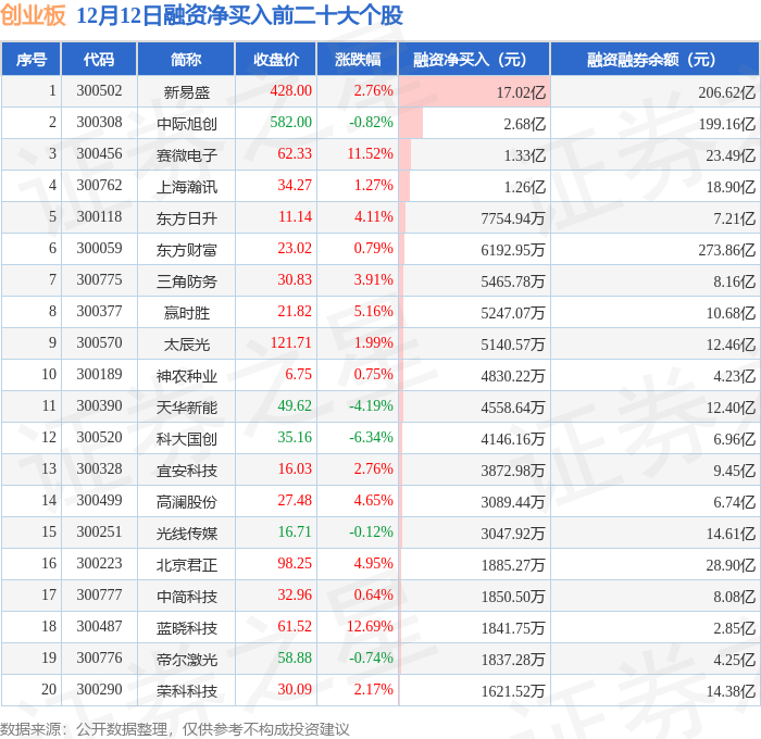创业板融资净买入前三分别为:新易盛(300502)融资净买入17.02亿元、中际旭创(300308)融资净买入2.68亿元、赛微电子(300456)融资净买入1.33亿元,前20具体见下表: