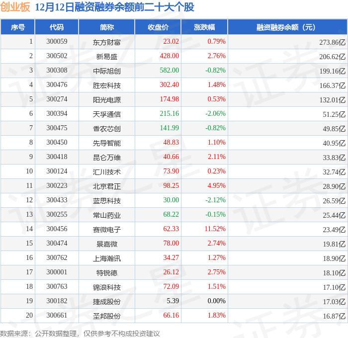 创业板融资融券余额前三分别为:东方财富(300059)融资融券余额273.86亿元、新易盛(300502)融资融券余额206.62亿元、中际旭创(300308)融资融券余额199.16亿元,前20具体见下表: