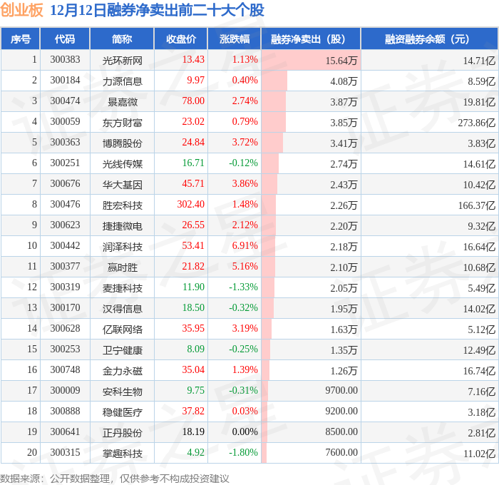 创业板融券净卖出前三分别为:光环新网(300383)融券净卖出15.64万股、力源信息(300184)融券净卖出4.08万股、景嘉微(300474)融券净卖出3.87万股,前20具体见下表: