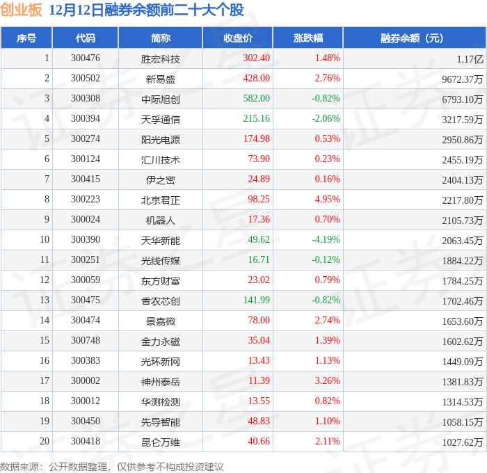创业板融券余额前三分别为:胜宏科技(300476)融券余额1.17亿元、新易盛(300502)融券余额9672.37万元、中际旭创(300308)融券余额6793.1万元,前20具体见下表: