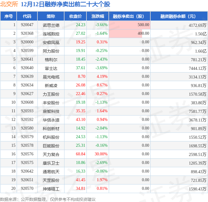北交所融券净卖出前三分别为:诺思兰德(920047)融券净卖出500股、连城数控(920368)融券净卖出400股,前20具体见下表: