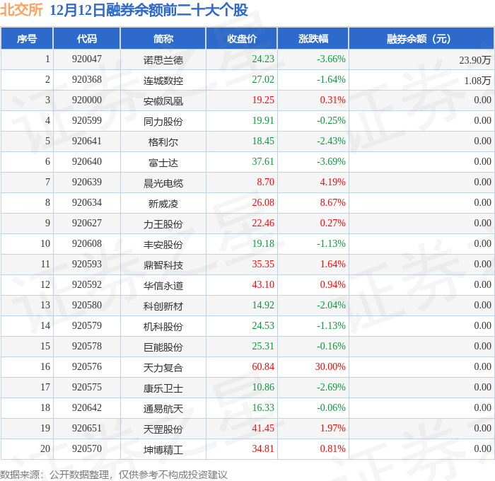 北交所融券余额前三分别为:诺思兰德(920047)融券余额23.9万元、连城数控(920368)融券余额1.08万元,前20具体见下表: