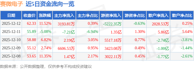12月12日的资金流向数据方面,主力资金净流入3193.81万元,占总成交额0.39%,游资资金净流出5222.35万元,占总成交额0.63%,散户资金净流入2028.53万元,占总成交额0.25%。