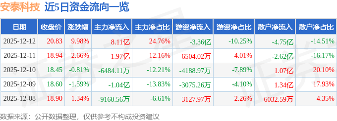 证券之星消息,截至2025年12月12日收盘,安泰科技(000969)报收于20.83元,上涨9.98%,涨停,换手率15.69%,成交量162.23万手,成交额32.78亿元。