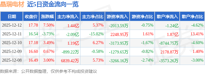 证券之星消息,截至2025年12月12日收盘,晶瑞电材(300655)报收于17.78元,上涨7.5%,换手率14.39%,成交量153.64万手,成交额26.83亿元。