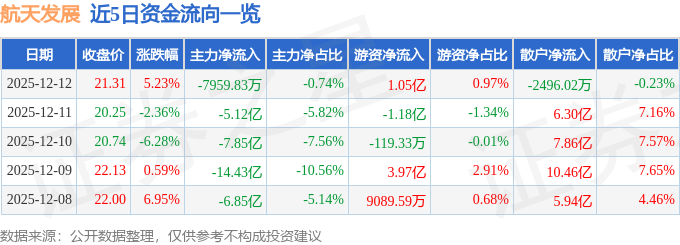 证券之星消息,截至2025年12月12日收盘,航天发展(000547)报收于21.31元,上涨5.23%,换手率32.05%,成交量509.07万手,成交额107.52亿元。