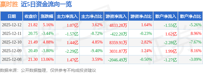 证券之星消息,截至2025年12月12日收盘,赢时胜(300377)报收于21.82元,上涨5.16%,换手率19.66%,成交量135.86万手,成交额29.46亿元。