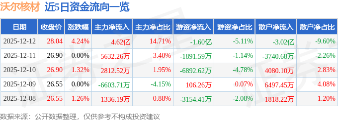 12月12日的资金流向数据方面,主力资金净流入4.62亿元,占总成交额14.71%,游资资金净流出1.6亿元,占总成交额5.11%,散户资金净流出3.02亿元,占总成交额9.6%。