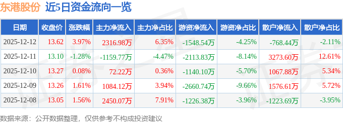 证券之星消息,截至2025年12月12日收盘,东港股份(002117)报收于13.62元,上涨3.97%,换手率5.16%,成交量27.02万手,成交额3.65亿元。