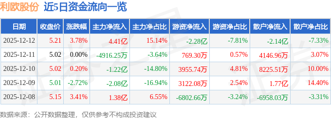 证券之星消息,截至2025年12月12日收盘,利欧股份(002131)报收于5.21元,上涨3.78%,换手率9.75%,成交量570.64万手,成交额29.15亿元。