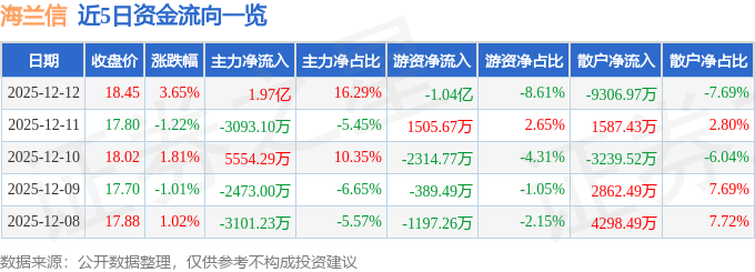 证券之星消息,截至2025年12月12日收盘,海兰信(300065)报收于18.45元,上涨3.65%,换手率10.07%,成交量66.06万手,成交额12.11亿元。