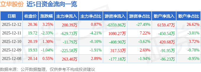 证券之星消息,截至2025年12月12日收盘,立华股份(300761)报收于20.36元,上涨3.25%,换手率1.83%,成交量11.5万手,成交额2.31亿元。