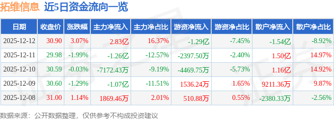 证券之星消息,截至2025年12月12日收盘,拓维信息(002261)报收于30.9元,上涨3.07%,换手率4.93%,成交量56.48万手,成交额17.28亿元。