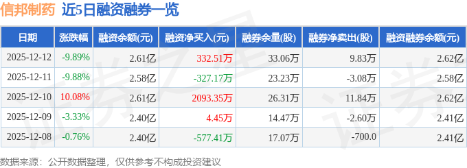 证券之星消息,截至2025年12月12日收盘,信邦制药(002390)报收于3.37元,下跌9.89%,换手率8.07%,成交量155.62万手,成交额5.28亿元。